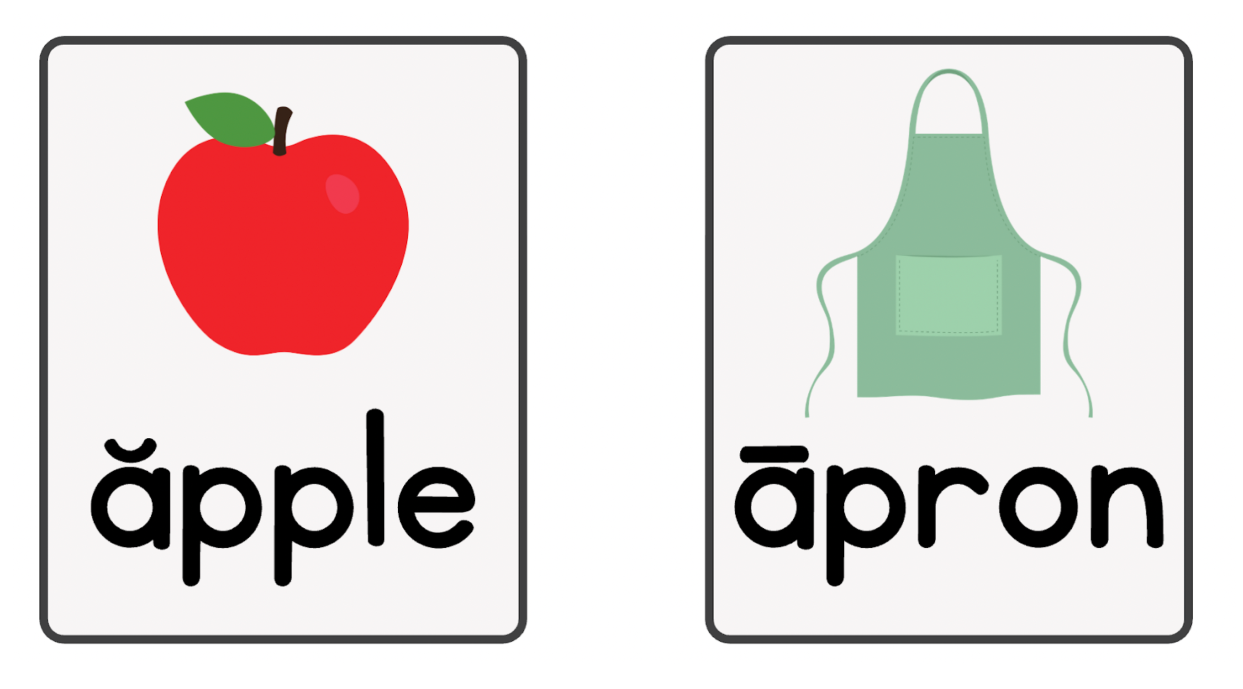 Short vowels are pronounced with a more open and relaxed mouth. They are commonly found in words where the vowel is followed by a consonant, forming consonant-vowel-consonant (CVC) words. Short vowels are also the ones kids usually hear first. Here are a few examples: